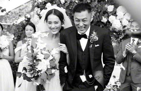 In the photo, the 36-year-old laughed heartily and his bride Sarah Wang tightly held his arm.
