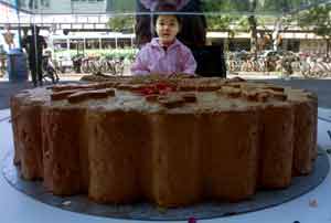 A Chinese girl looks at a giant mooncake on display outside a shopping mall in Beijing on September 30. The sales of the traditional Mid-Autumn Festival delicacy has slumped in mainland China following a report that emerged in early September that a well-known Chinese bakery was putting year-old fillings in its mooncakes. [Reuters]