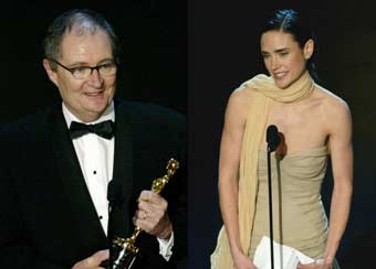 The supporting actor Oscars at Sunday night's 74th Annual Academy Awards may be emblematic of this year's unpredictable race. The first, for best supporting actress, went to a favored candidate - Jennifer Connelly, for her role in "A Beautiful Mind." But in a huge upset, Jim Broadbent won the Oscar for best supporting actor, for his role as the husband of Iris Murdoch in "Iris." The overwhelming favorite in the category had been Ian McKellen, who played the role of Gandolf in "The Lord of the Rings." Connelly, in accepting her award, read a note of gratitude with so little inspiration that it betrayed her words. "I believe in love, that there is nothing more important. Alicia Nash is a true champion of love," Connelly said, reading dully from a prepared speech, as her fellow cast members and the film's director Ron Howard sat in the audience and beamed. Connelly won for playing Alicia Nash, the long suffering wife of Nobel prize-winning mathematician and schizophrenic John Nash, played by Russell Crowe. The film is up for eight Oscars including best film, best director and best actor. Oscar host Whoopi Goldberg got the show on the road after a preamble by Tom Cruise, who took a moment to mention the Sept. 11 terrorist attacks, saying he talked with a friend about whether his work as an actor was important in light of the tragedy. "What about a night like tonight? Should we celebrate the joy and magic movies bring? Dare I say it? More than ever," Cruise said, drawing enthusiastic applause. "A small scene, a gesture, even a glance between characters can cross lines, break through barriers, melt prejudice or just plain make us laugh." Cruise went on to introduce a film featuring talking heads naming their favorite movies.