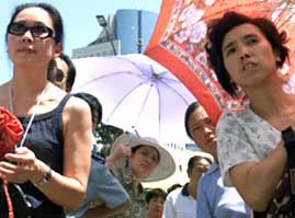 Parents wait anxiously outside a Beijing school as their children take part in university entrance exams on July 7, 2002. It is learned next year's exams will take place one month earlier to escape usually the calender's steamiest month. This year, about 52% of the 5.8 million candidates are expected to receive higher education. [Reuters]