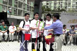 A social worker (Front, 1st R) distributes cleaning tools to volunteers at the start-up ceremony of a campaign in Hong Kong April 19. Hong Kong Saturday launched a two-day government and district-driven campaign to encourage the residents to clean their homes, offices, schools, public areas and districts. Over 6,000 volunteers joined the campaign in cleaning the houses of over 2,000 elderly people living alone and distributed to them hygiene kits and spread knowledge on how to prevent the SARS. [Xinhua]