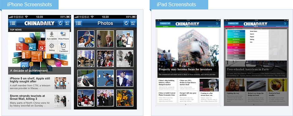 產(chǎn)品融會文本、圖像和音頻、視頻等多媒體呈現(xiàn)方式,第一時間展示《中國日報》媒體集團主報、海外子報及網(wǎng)站的主要實時資訊。其中獨家原創(chuàng)的視頻欄目是及時展現(xiàn)中國動態(tài)的一個重要渠道。