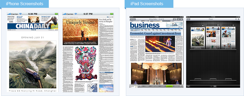這款產品以電子版形式,在iPhone與iPad上呈現《中國日報》當天全部內容的紙媒版式設計。產品融合了新媒體的閱讀體驗,如可以調整字體大小,與好友分享內容,音頻讀報等。產品的推出大大方便了那些喜歡紙媒體驗而又接觸不到印刷版《中國日報》的用戶。