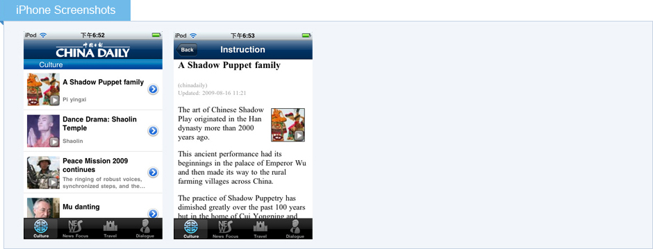 產品以獨家原創視頻內容架設起外部世界了解中國的橋梁,它以國際化的視角娓娓講述不為人所熟知的中國故事,透視中國的熱門話題,生動逼真地展現一個活生生的中國。內容主要包括名人采訪、熱點新聞事件、文化遺產和自然奇跡。