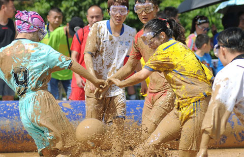 Swamp soccer: Players battle for ball in Nanjing